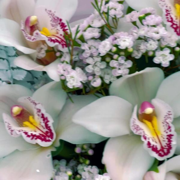 Орхидея Цимбидиум - 7 шт.Папоротник - 2 шт.Рускус - 10 шт.Лента атласная - 1 шт.Упаковка дизайнерская - 4 шт.гипсофила радужная - 2 шт.